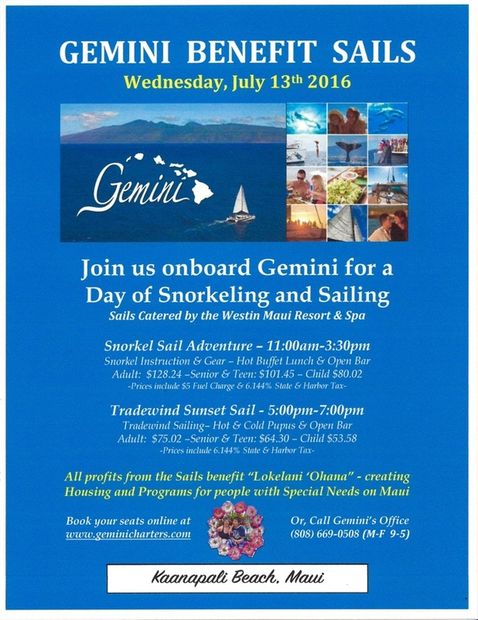 Our deepest gratitude to Gemini Charter Sailing owner Ming Shipp, her ohana and the crew for their generous donation towards our goal in meeting a $20K matching grant to install a wheel chair lift in Lokelani 'Ohana's new home serving adults with developmental disabilities with long term housing. Way to go team!!! The $20,000 was raised thanks to Ming shipp and Ohana and many other friends of Lokelani 'Ohana!
